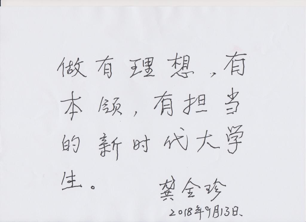 交流中,老阿姨勉励同学们,你们是新时代的有志青年,希望你们勤奋学习,奋发向上,立志成为有理想、有本领、有当担的大学生,做新时代的建设者,为中华民族伟大复兴奉献力量。并为萍乡学院的学生们书写寄语:“做有理想、有本领、有担当的新时代大学生。”