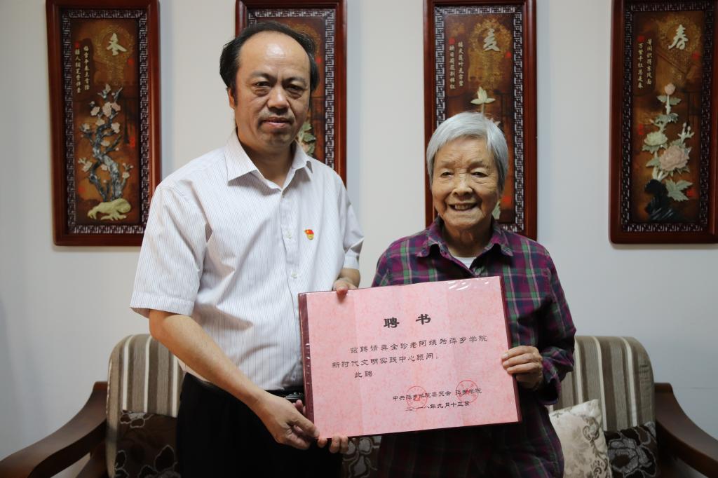 9月13日,党委书记陈金印赴莲花县龚全珍老阿姨家中,看望老阿姨并聘请她担任学校“新时代文明实践中心”顾问。老阿姨高兴地接过聘书,表示自己一定会尽心尽力,为萍乡学院“新时代文明实践中心”建设作出自己的贡献。