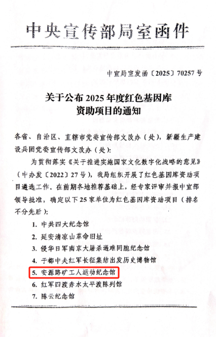 根据中央宣传部文化改革发展局印发《关于公布2025年度红色基因库资助项目的通知》,安源路矿工人运动纪念馆凭借其深厚的革命历史底蕴、丰富的馆藏资源以及深远的社会教育功能,成功入选该资助项目。 红色基因库建设是新时代红色资源保护传承的重要工程。通过高精度数据采集技术,对红色文化资源进行系统性数字化处理,并按照国家统一标准进行结构化存储,并以历史事件、英烈人物、感人故事为线索,对这些数据进行全国联网,为红色文化的广泛传播奠定坚实基础。安源路矿工人运动纪念馆的入选,将进一步助力在红色资源数字化、智慧化建设方面提质升级,让观众能穿越历史场景,与文物进行对话,增强红色文化的吸引力和感染力。