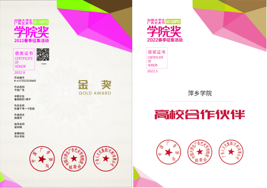 在2022年中国大学生广告艺术节学院奖中,我校艺术学院与文传学院携手组织的参赛团队在大赛中喜获佳绩。我校荣获“高校合作伙伴”最佳团体奖,艺术学院颜惠萍同学荣获金奖,这是艺术学院连续第三年荣获学院奖大赛金奖。获奖学生受邀参加了颁奖盛典。