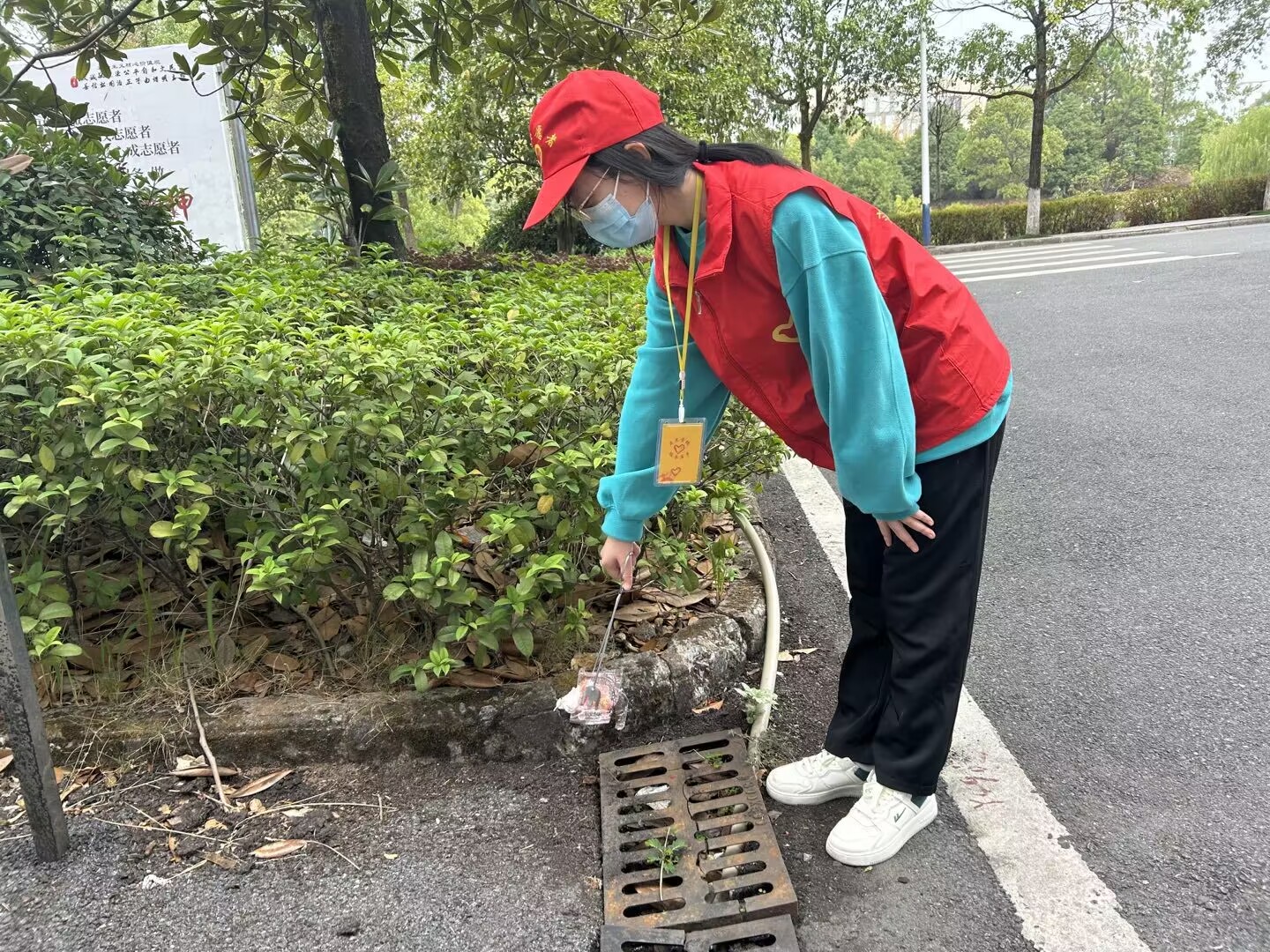 “小红帽”的身影总穿梭在学校的每个角落。他们身穿红色马甲,手里拿着黑色塑料袋和垃圾夹,清理校园的每个角落。“因为现在静态管理,打扫的阿姨们都进不来,但学校还是要保持干净、整洁。所以我们青协组织了一批志愿者为学校服务。”