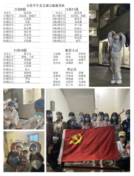 11月8日,九栋寝室因疫情防控需要暂时实行封闭式管理,文传学院学生第一党支部和学生第二党支部立即开展疫情防控志愿服务活动,学生党员、预备党员和入党积极分子参加。