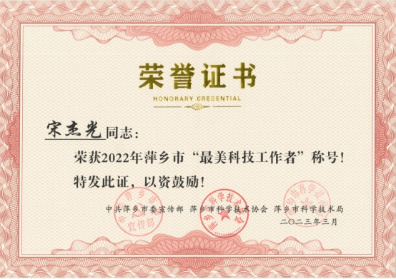 陈威红指出,我校为全市的科技服务和科普活动做出了巨大贡献,希望学校一如既往支持市科协的活动,实现校地同频共振,双融双促。陈威红为宋杰光博士颁发了2022年度萍乡市“最美科技工作者”荣誉证书。