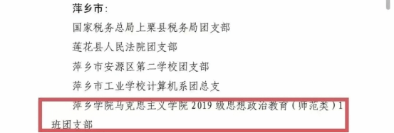 在五四青年节到来之际,共青团江西省委印发《关于表彰全省五四红旗团委(团支部)、全省优秀共青团员、全省优秀共青团干部的决定》,我校马克思主义学院2019级思想政治教育(师范类)1班团支部荣获“全省五四红旗团支部”荣誉称号。
