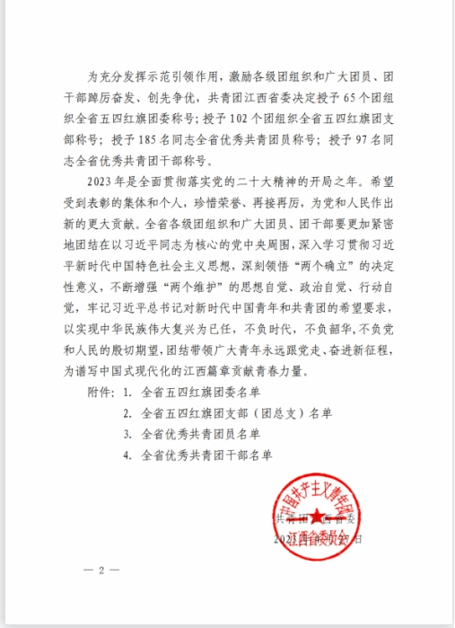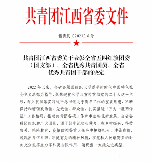 新时代开启新征程,在贯彻党的二十大精神的开局之年,我校共青团工作将珍惜荣誉、再接再厉,牢记习近平总书记对新时代中国青年和共青团的希望要求,以实现中华民族伟大复兴为己任,不负时代,不负韶华,为谱写中国式现代化的江西篇章贡献青春力量。
