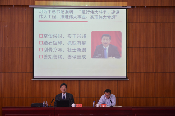 10月27日上午,我校在至善楼学术报告厅召开党委理论学习中心组(扩大)学习会议。中共中央党史研究室薛庆超研究员应邀为我校做了“十九大”精神专题辅导报告。党委副书记蔡宝琦主持会议。校党委中心组全体成员,中层以上干部,全体思想政治理论课教师,二级学院团总支书记参加会议。