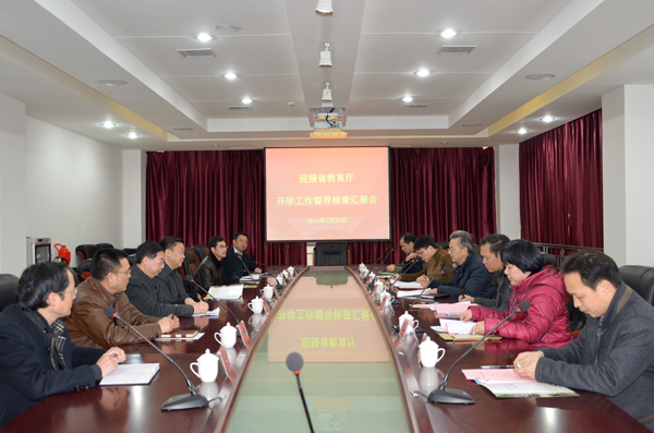 2月24日,以省教育厅装备站副主任熊春光为组长的督导检查组一行莅临我校检查指导开学工作。下午4点半,我校在至善楼第二会议室举行了汇报会,校领导郭伟、刘卫林以及相关职能部门负责人参加会议。会议由郭伟主持。