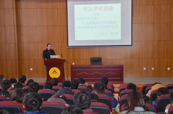 报告中,黄小平讲述了金属微纳阵列结构的电化学制备到光控制组织生长的用途及良好发展前景,分享了自己做科研的经历和工作心得,分析了科学创新对于科研工作的重要性。最后,他强调科研之路的成功在于,良师的诱发和具有不懈探索的精神。并鼓励在座的师生坚持自己的理想,脚踏实地做好每一件事,爱岗敬业报效祖国。