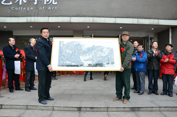 开幕式上,郭伟为陈先水先生颁发了聘书,聘请陈先水先生为我校艺术学院客座教授。陈先水先生为我校捐赠了一副亲笔绘作的水墨画,这副绘画作品画工精良,或写实写意,或浓墨重彩,线条细腻流畅,展示了陈先水先生在绘画方面的深厚功底与艺术造诣。