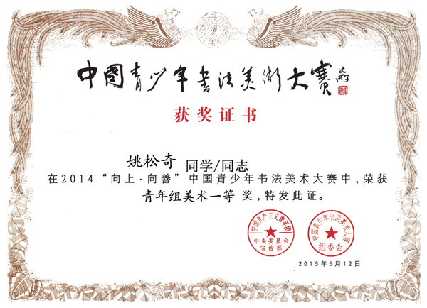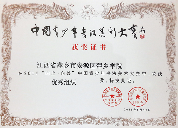 历经一年之余的层层筛选、评审,我校艺术学院教师姚松奇老师荣获青年组美术类一等奖;李思杨学生荣获青年院校组美术类一等奖;茆宁、潘胜琴学生荣获青年院校组美术类二等奖;莫筱羽、刘佳明、李成龙、王清、蔡佳敏、石家麟、张振江、彭心怡、付雪馨、张立蕊、李鹏飞、廖泽楠、潘胜琴、蓝青学生荣获青年院校组美术类优秀奖;姚松奇老师荣获优秀指导教师奖;萍乡学院荣获优秀组织奖。大赛获奖作品结集成书《“向上•向善”中国青少年书法美术大赛获奖作品集》,由北京教育出版社出版发行。