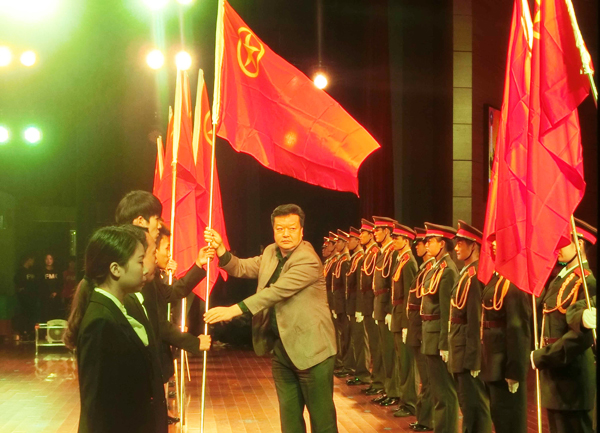 晚会开始前,校团委负责人宣读了《关于表彰萍乡学院践行社会主义核心价值观示范团支部的决定》,郭伟副院长为示范团支部授了团旗。