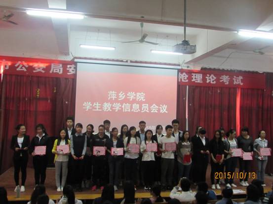 王强宣读了2014-2015学年度优秀学生教学信息员获奖名单。26名同学荣获2014-2015学年度 “优秀学生教学信息员”称号,郭伟、叶国许、易志文、王强和朱艳琴为优秀学生信息员颁发荣誉证书。