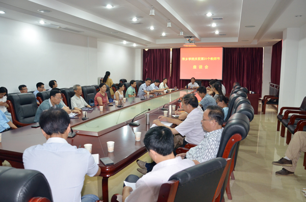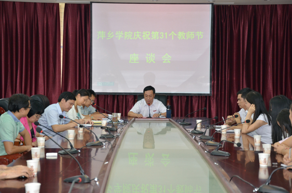 在教师节即将来临之际,我校在第二会议室召开庆祝第31个教师节座谈会。院长范小林、副院长郭伟、邱建丁,校领导田常红、陈永秀、陈永国出席座谈会,退休教师代表、优秀教师代表、学生代表,各相关职能部门和二级学院负责人参加座谈会,会议由田常红主持。
