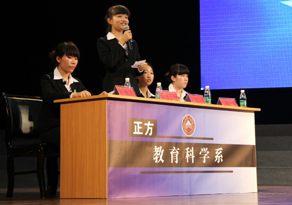 比赛在热烈的拉歌环节中开始。正方教科系与反方外语系紧紧围绕着“实现中国梦重在弘扬爱国主义精神还是改革创新精神”展开了激烈的角逐。比赛一开始,双方的出场方式就给人耳目一新的感觉,“教师体”与“甄嬛体”在赛场给观众留下了深刻的映象。不一会儿,赛场气氛就紧张而激烈起来。比赛中,辩手们据理力争,唇枪舌剑,毫不示弱,巧妙地应变,精彩的辩词使台上台下气氛活跃,观众的掌声、欢呼声、喝彩声更是此起彼伏,声声不断。经过激烈的比赛,最终教科系以90.4分赢得比赛,荣获冠军。外语系夺得亚军,经管系和化工系获得季军。团市委书记何超,团市委副书记汤艳红、李志猛分别为冠亚季军颁奖。