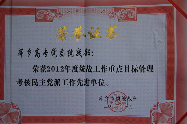 3月21日,全市统战部长会议召开,校党委统战部荣获“2012年度全市统战工作目标管理考核民主党派工作先进单位”称号。