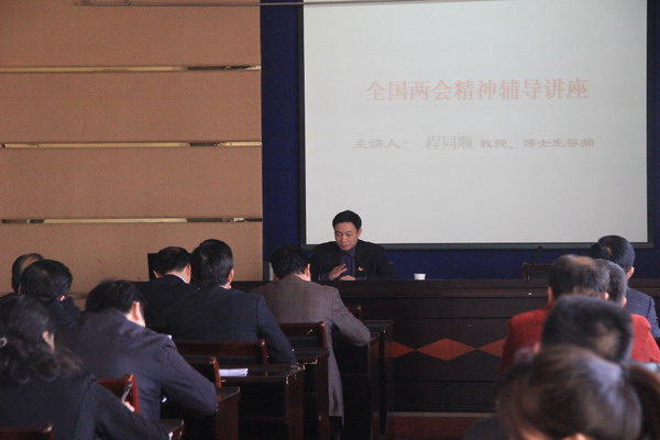 会上,副校长、博士生导师程同顺教授作了全国两会精神辅导讲座。讲座从十八大和全国两会的视角出发,深入阐述和分析了当前我国经济、政治、社会、教育、医疗、内政、外交等面临的形势和发展趋势。讲座见解独到、观点精辟、内容丰富,使我们开阔了视野,理清了思路,全面领会了十八大和两会精神的实质和丰富内涵。