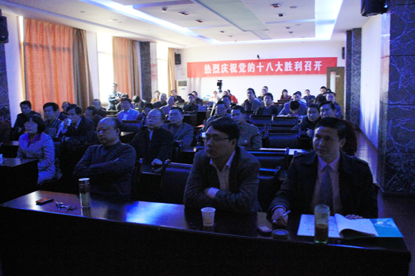 (图为我校集体收听收看党的十八大开幕式盛况的会场之一:鼎新楼2403会议室会场)