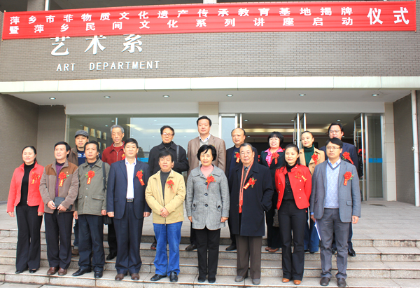 萍乡市非物质文化遗产传承教育基地由市群众艺术馆和萍乡高等专科学校艺术系联合创办,该基地设在萍乡高专,通过开办“非遗”校园讲坛、举办“非遗”培训班、开展“非遗”宣传周等活动,将优秀的民族艺术与现今大学生的生活相融合,积极开展对萍乡本土非物质遗产的传承保护活动,培养年轻的传承人,走出一条高校与地方“联姻”、保护与传承“非遗”的新路子。