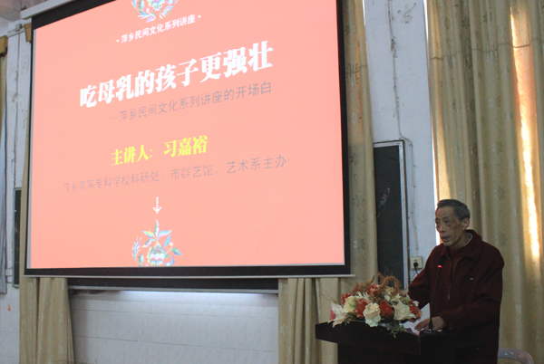 随后,习嘉裕教授在跬步楼1101室作了题为《萍乡民间文化系列讲座之—:吃母乳的孩子更强壮》的主旨讲座。他用生动形象的语言向我们阐述了弘扬民族文化的意义,向我们展示着萍乡文化特有的魅力。此讲座为提高大学生对萍乡民间艺术的兴趣、培养文化素养的理念和丰富自身的文学储备起到了积极的作用。(罗燕妮/文 黎嵩山/摄)
