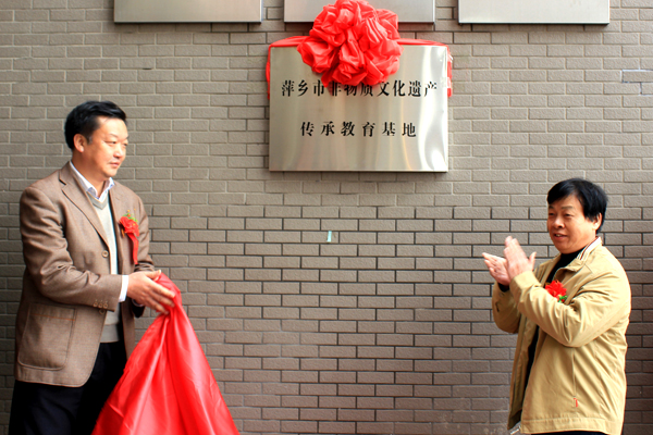 在热烈的掌声中,李晓萍和郭伟为萍乡非物质文化遗产传承教育基地揭牌。