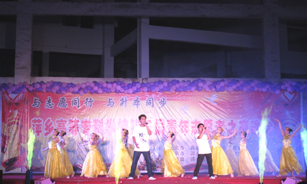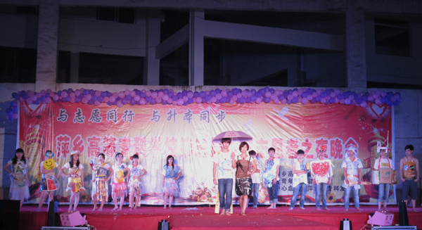 六月的鲜花,争奇斗艳;六月的歌声,婉转动听;六月的校园,欢声笑语。六月的萍乡高专鲜花与歌声相映,歌声与笑声齐飞,处处洋溢着爱的浓厚氛围。为进一步加强我校共青团基层组织建设,紧密结合学校建院升本工作,充分调动广大青年志愿者积极参与各项实践服务活动,6月7日晚,由校团委主办、青年志愿者协会承办的“与志愿同行,与升本同步”志愿者之夜晚会在我校风雨篮球场隆重举行。受萍乡市委委员、团市委书记何超委托,团市委组宣部部长谭丽琴、学校部部长梅岭、办公室副主任刘雨青、办公室科员钟小红、市学联驻会执行主席范雨晴、邬思出席晚会,校党委委员、副校长刘卫林,校党委委员、校长助理、组织人力资源部部长陈永秀,校党委委员、宣传统战部部长陈永国,计算机系主任苏啸,继续教育学院院长文发佑,仪器设备管理处处长黄绍斌,组织人力资源部副部长王献忠,校团委负责人刘德平,科发公司副总经理胡佶熹以及各系部团总支书记、副书记与近2000名师生代表观看了晚会。校团委通过微博形式全程直播了晚会实况。