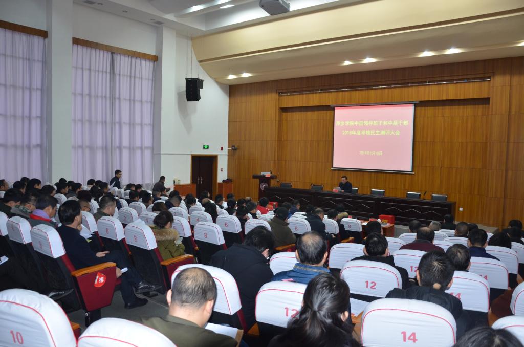 为深入贯彻落实习近平新时代中国特色社会主义思想和党的十九大精神,全面掌握、准确评价2018年度学校中层领导班子和中层干部履行职责情况,进一步加强对中层领导班子和中层干部的管理与监督、激励与约束。1月18日,我校在至善楼学术报告厅召开2018年度中层领导班子和中层干部述职考核测评大会。全体在家校领导、中层处级干部和部分教授、教师代表参加了会议,会议由党委副书记蔡宝琦主持。