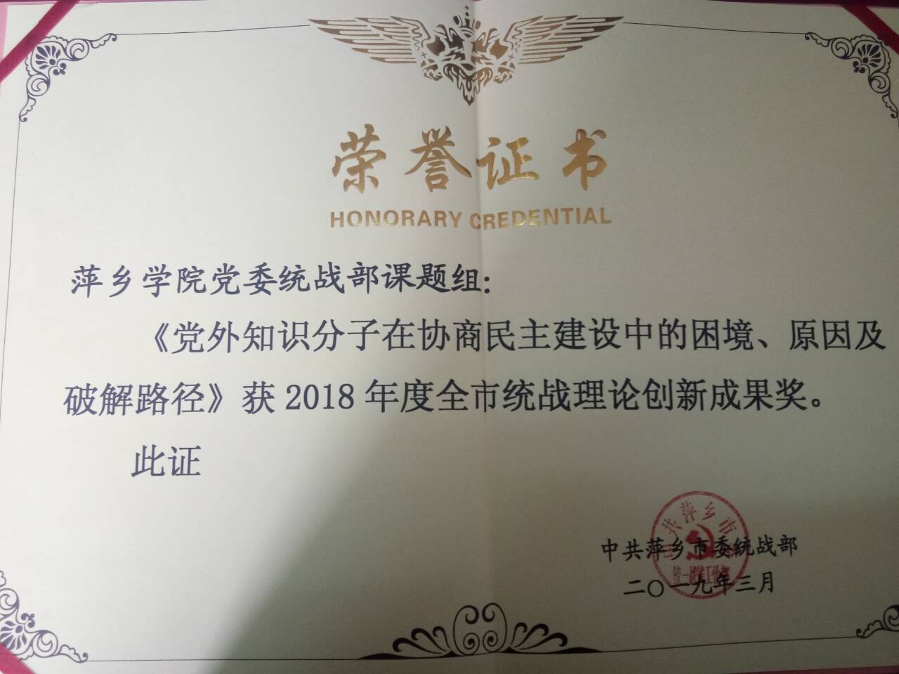近日,从《关于2018年度全市统战理论政策研究创新成果、全市统战工作实践新成果、全市统战宣传信息工作先进单位和先进个人的通报》(萍统字【2019】8号)获悉,我校党委统战部课题组的《党外知识分子在协商民主建设中的困境、原因及破解路径》荣获2018年度全市统战理论创新成果奖。