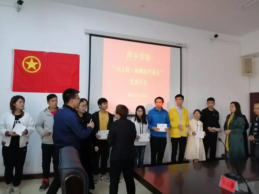 近日,我校于至善楼三楼第三会议室举行了2019年萍乡学院“1%工程•纵横基金”发放仪式。芦溪县人民政府副县长、民进萍乡市工委会副主委刘洁兰、学校团委书记刘德平、民进萍乡市工委会办公室主任钟水兵、“ 1%工程”纵横志愿服务站秘书长张平、“1%工程”纵横志愿服务站萍乡站志愿者代表葛美莲、民进萍乡学院支委主委付红玲、委员刘淼鑫、周荣华出席发放仪式。