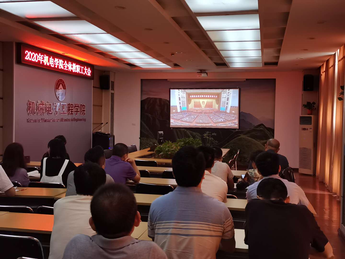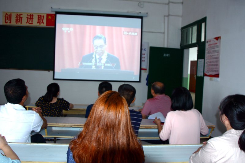 校领导、机关部门教职员工分别在第一会议室和学术报告厅收看了大会直播。各二级学院在本单位会议室组织了师生收看大会直播。