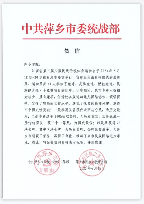 近日,我校收到来自市委统战部发来的贺信,祝贺并感谢我校代表萍乡市在江西省第三届少数民族传统体育运动会上获得佳绩。