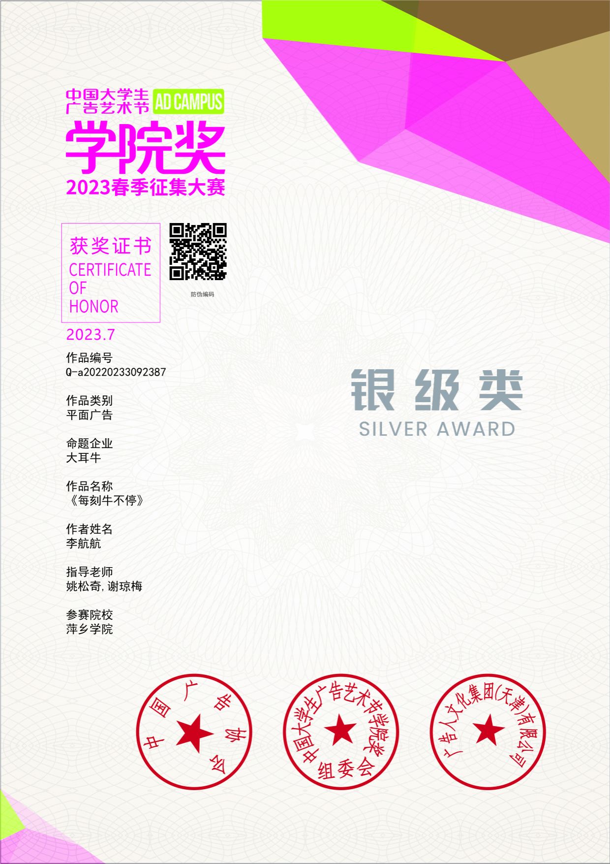 我校艺术学院参赛团队在2023年中国大学生广告艺术节学院奖喜获佳绩。艺术学院李航航同学荣获银奖,获奖师生受邀参加了颁奖盛典。这是一次业界大咖、学界专家们齐聚一起的创意盛会,来自全国高校的师生一起,让年轻与创意碰撞出绚烂的火花,让梦想与荣耀在这里灿烂盛放!