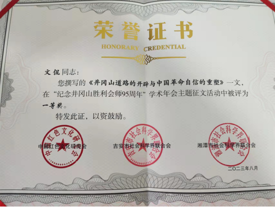 8月25日,2023首届“弘扬井冈山精神”学术年会在井冈山大学举行。江西省安源精神研究会副会长、我校安源红色文化研究中心教授文侃撰写的《井冈山道路的开辟与中国革命自信的重塑》一文在“纪念井冈山胜利会师95周年”学术年会主题征文活动中荣获一等奖,并作为优秀论文代表在年会上作主旨发言。