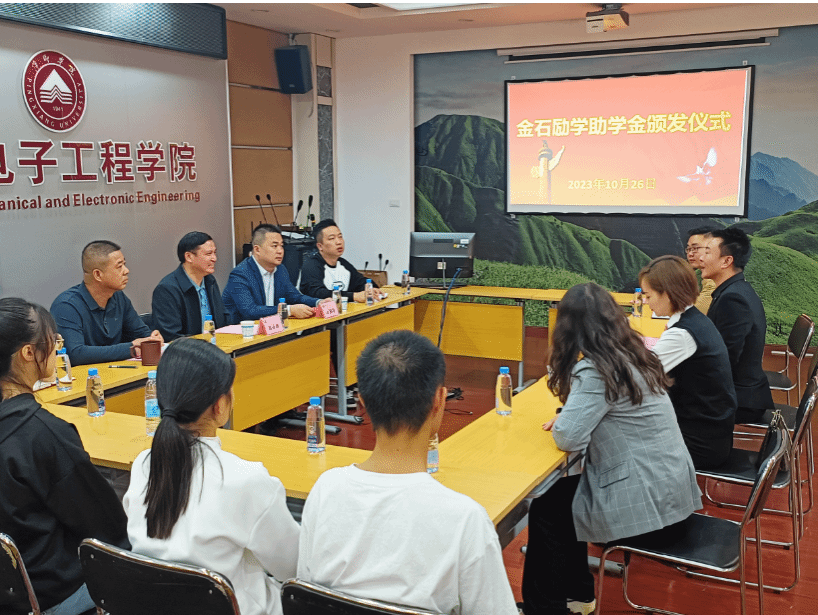 “爱心捐资助学,情暖莘莘学子。”10月26日上午,江西金石三维智能制造科技有限公司“金石励学助学金”颁发仪式在我校鼎新楼2200会议室举行。校党委委员、副校长陈永国,公司总经理王小博,公司行政经理杨婷,学工处处长江惺俊,机械电子工程学院班子成员、教师代表以及受助学生共同出席仪式,见证这场爱心传递仪式。仪式由机械电子工程学院党委书记王斌主持。