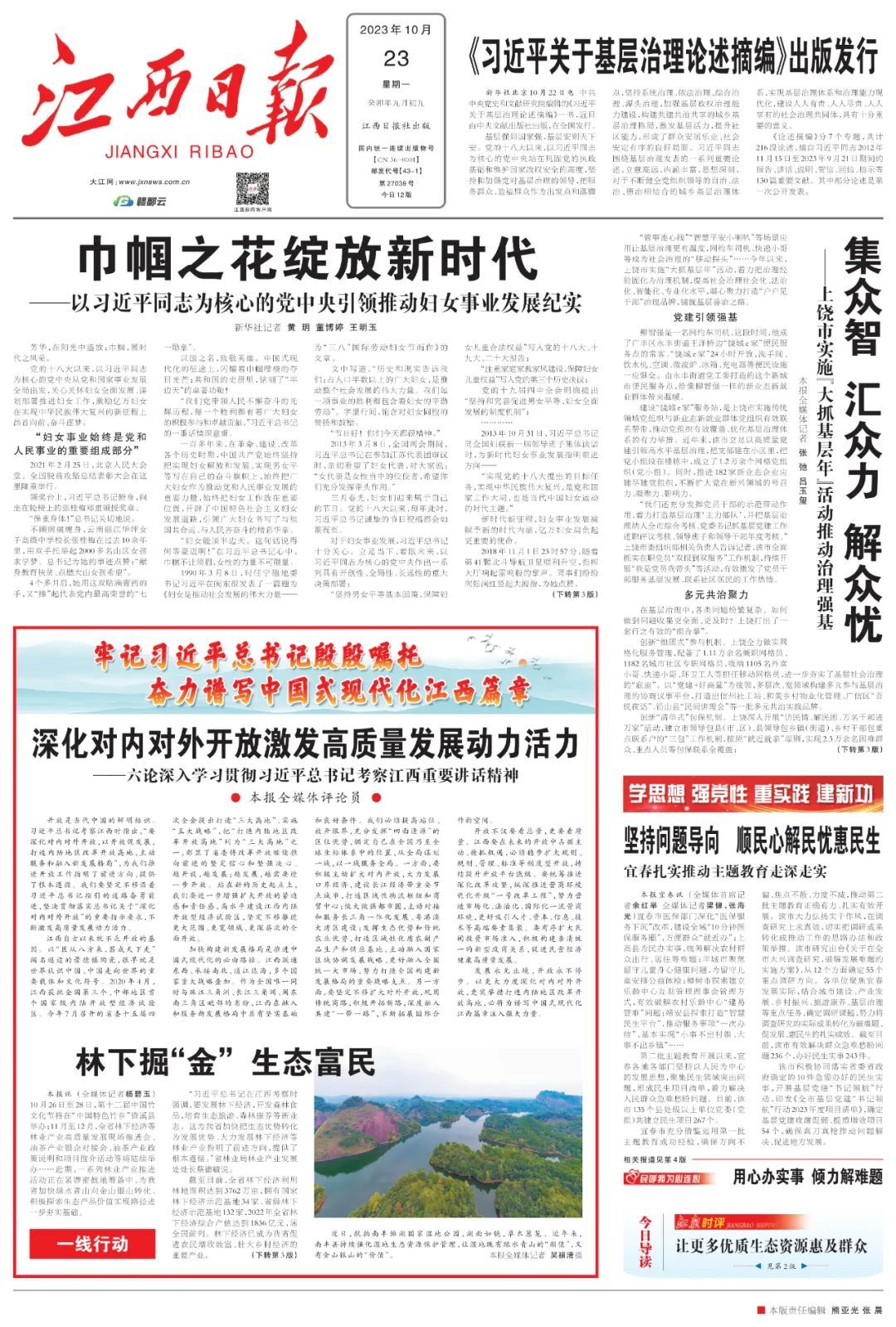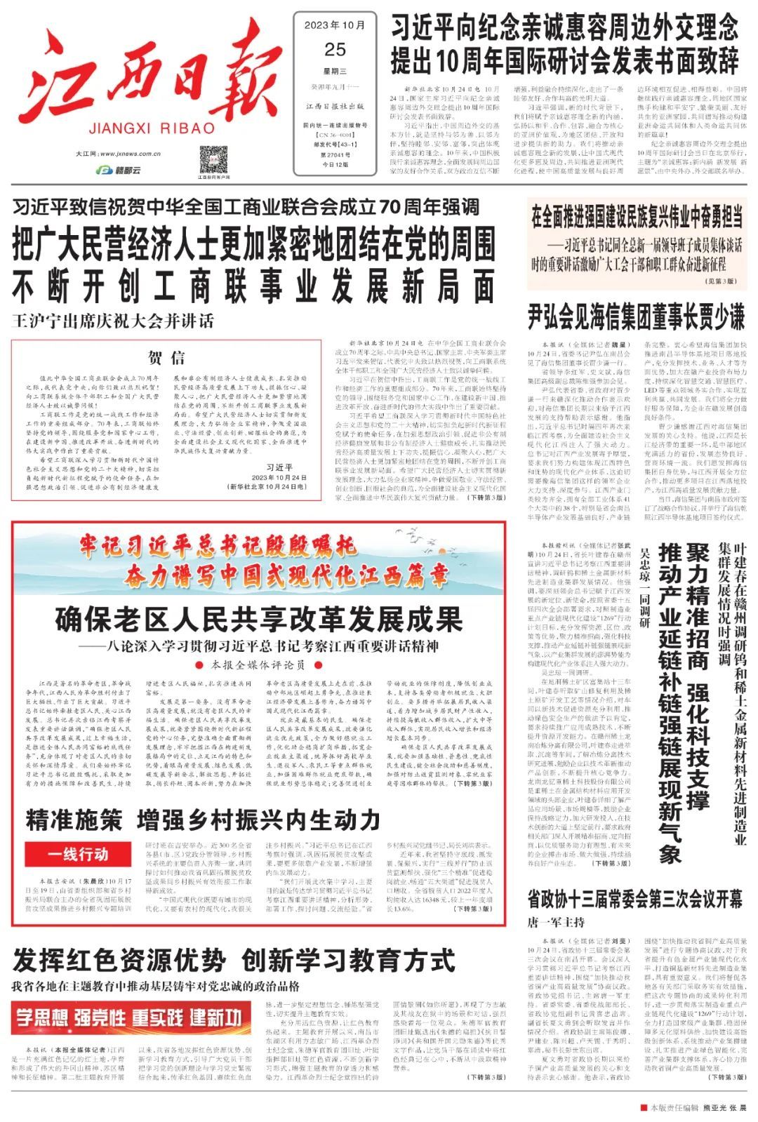 江西是著名的革命老区,革命战争年代,江西人民为革命胜利付出了巨大牺牲、作出了巨大贡献。习近平总书记始终牵挂老区人民、关心江西发展。总书记再次亲临江西考察并发表重要讲话强调,“确保老区人民共享改革发展成果,过上幸福生活,是推进全体人民共同富裕的底线任务”,充分体现了对老区人民的亲切关怀和深情厚爱。我们要始终牢记习近平总书记殷殷嘱托,采取更加有力的措施保障和改善民生,持续增进老区人民福祉,扎实推进共同富裕。