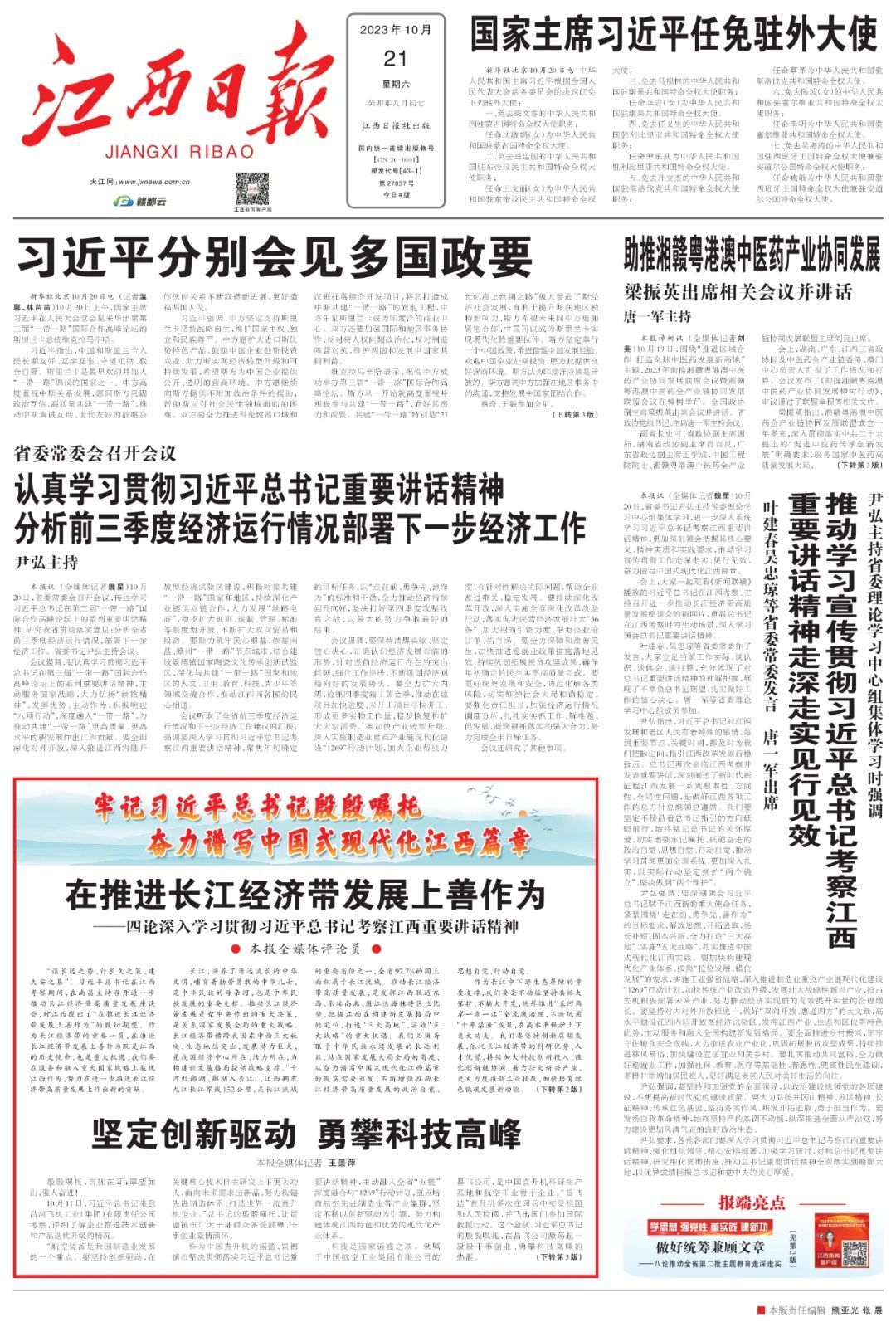 习近平总书记时隔四年再次亲临江西考察指导,充分体现了对革命老区的深情厚爱,为我们奋进新征程注入了强大精神动力。全省上下要充分认识习近平总书记考察江西的重大意义,准确把握总书记对江西工作的重要要求,解放思想、开拓进取,扬长补短、固本兴新,把总书记的殷殷嘱托化为赣鄱大地的生动实践。