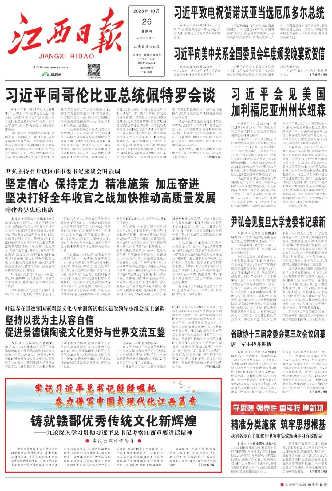 意蕴深厚、内涵丰富的赣鄱优秀传统文化,是江西行进于历史长河中最充沛的养分、最深沉的力量。红色、绿色、古色文化交相辉映,陶瓷文化、书院文化、中医药文化和江西诗派、江西画派、江西戏曲等特色文化闪耀夺目,赋予了江西独特的文化气质,为我们在新时代新征程加快建设文化强省奠定了坚实基础。我们要坚持以习近平文化思想为指导,深入学习贯彻习近平总书记考察江西重要讲话精神特别是保护传承优秀传统文化的重要指示要求,坚持守正创新,主动担当作为,加快建设文化强省,把赣鄱优秀传统文化名片擦得更亮,让千年文脉展现岁月之美、绽放时代光彩。