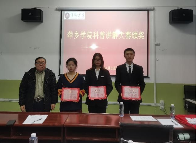 根据总分排名,评出了一等奖2名,二等奖3名,三等奖5名,优秀奖10名,科研处、团委、市科协普及部负责人和评委共同为获奖学生颁奖,前5名选手将代表萍乡学院参加江西省科普讲解大赛,前20名选手入选萍乡学院第一批科普服务队,为学校下一阶段的科普活动储备人才。
