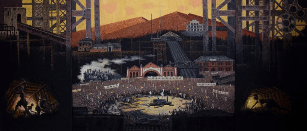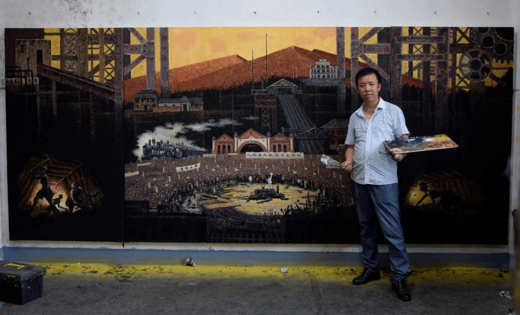 这幅油画长4.2米,高1.8米,是唐柏林老师历时8个月的时间,以闻名全国的安源路矿工人大罢工为题材,精心创作的一幅美术作品。作品构思巧妙,采用了“三联画”的艺术形式,中间展现了大罢工的宏大场景,两侧则是旧时安源工人的劳动景象,反映了他们在党的领导下团结一心、奋起斗争的历程。