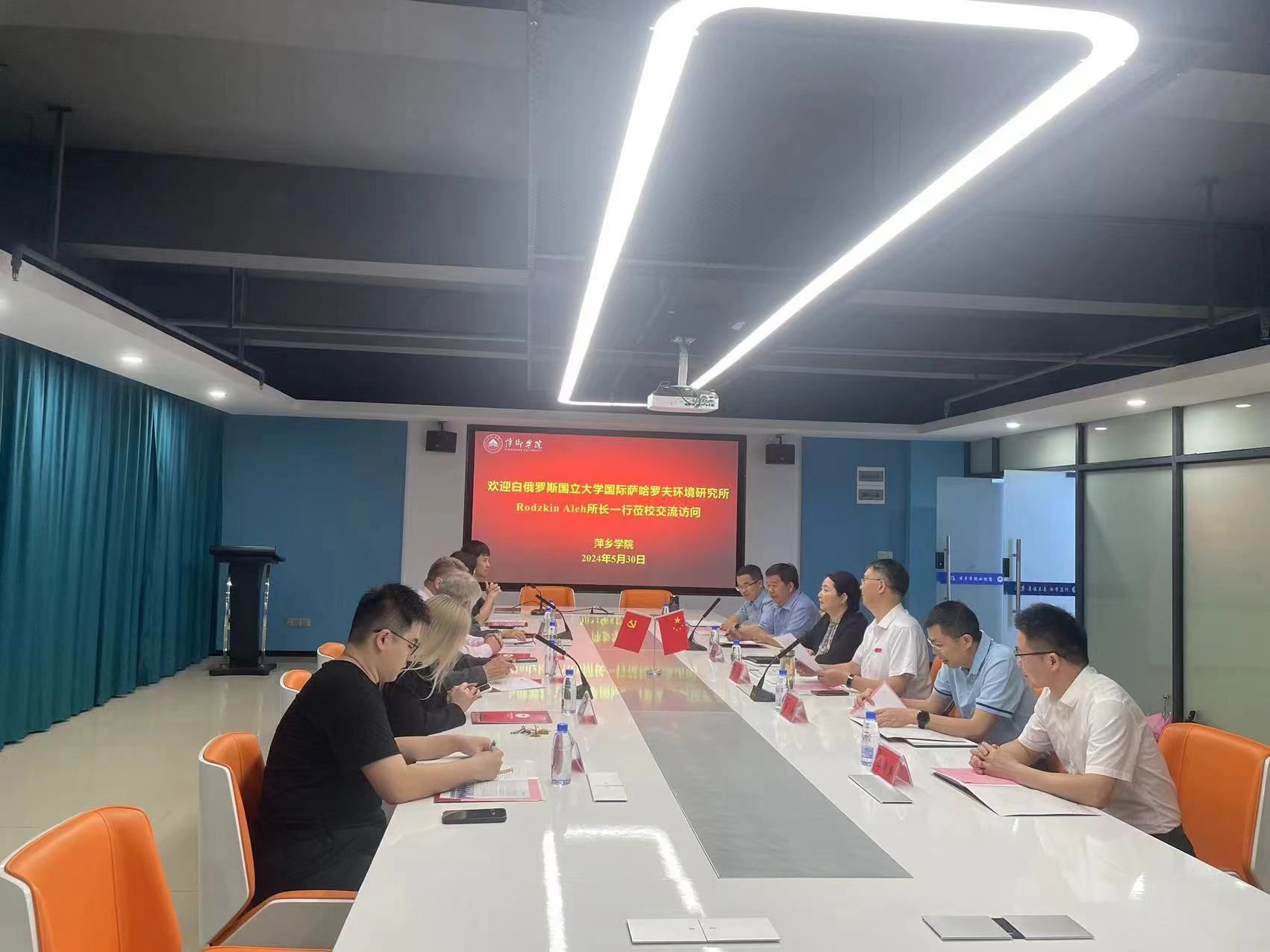 5月30日上午,白俄罗斯国立大学国际萨哈罗夫环境研究所所长Rodzkin Aleh(罗兹金·奥列格·伊万诺维奇)、外事办主任Aliakseichyk Alena(阿列克谢.伊莲娜)、教务署副署长Zhuraukou Uladzislau(朱拉夫·弗拉迪斯拉夫·弗拉基米罗维奇)莅临我校交流访问。副校长吴代赦、科学研究处处长罗小燕、国际教育与交流中心主任黎海玲、材料与化学工程学院院长王献忠、教务处副处长王强、信息与计算机工程学院副院长李希勇参加座谈交流。