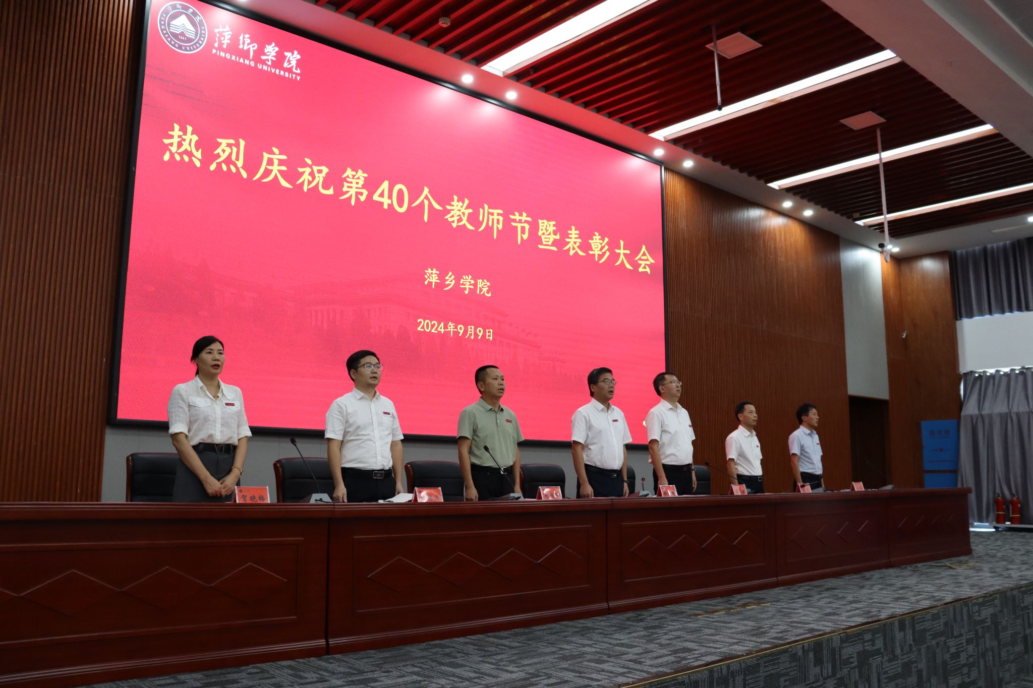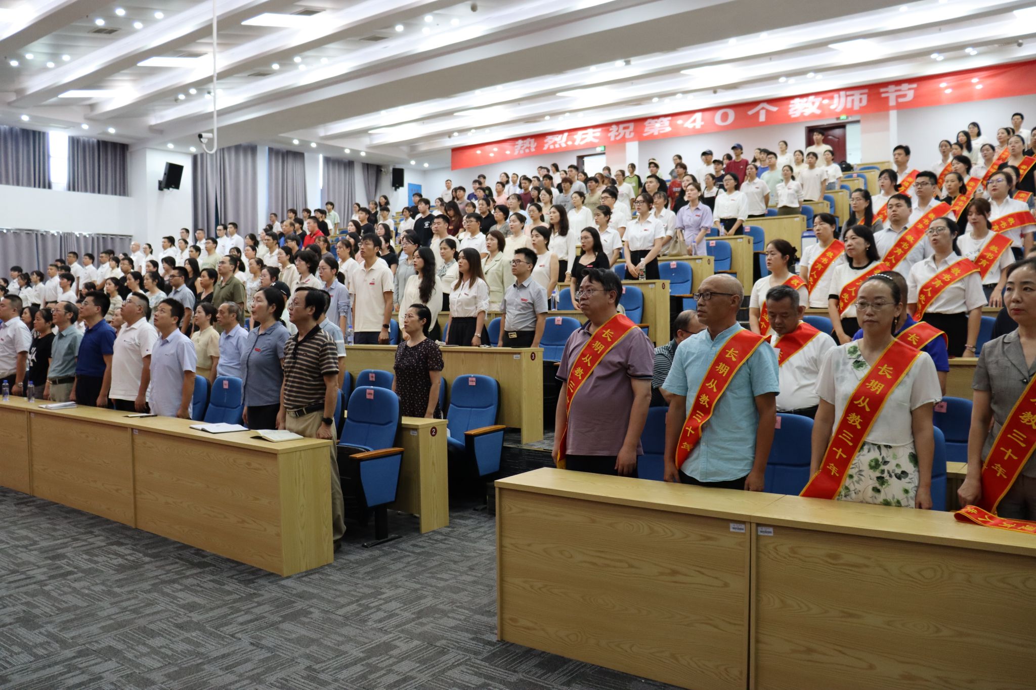 秋风九月初闻丹桂,潜心育人桃李芬芳。9月9日下午,在第40个教师节来临之际,我校在天泉楼三楼报告厅召开庆祝第40个教师节表彰大会。全体在家校领导,各二级学院院长、党委书记,各职能部门负责同志,各类受表彰教职工,2024年全体新入职教师和师生代表近300人共同参加了大会。会议由副院长吴代赦主持。