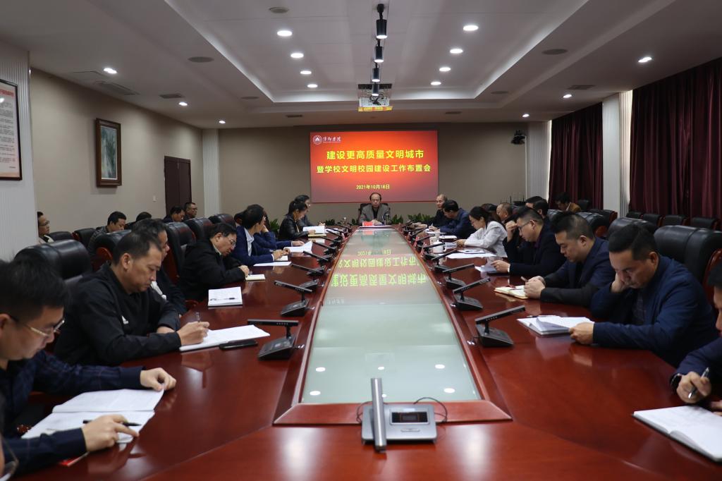 他强调,要提高政治站位,深刻理解市建设更高质量全国文明城市的重要意义。全校上下要统一思想、凝聚共识,以扎实的工作作风、务实的工作措施,补齐短板、打造亮点,乘势而为、攻坚克难,全力做好市建设更高质量全国文明城市各项工作任务,持续推进文明校园长效机制建设。要积极广泛参与,充分利用校园网、微信平台、宣传栏等阵地,为市建设更高质量全国文明城市营造浓厚的氛围。各单位要发挥示范引领作用,通过多种形式,传达学习好市建设更高质量全国文明城市工作布置会议精神,让每一个师生都积极参与到建设中来,营造争做文明创建参与者的浓厚氛围。