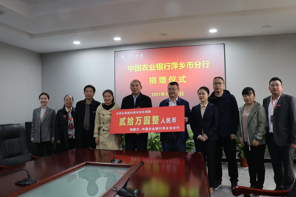 在80周年校庆即将到来之际,10月22日下午,中国农业银行萍乡市分行捐赠仪式在我校至善楼第二会议室举行。校党委副书记、校长史焕平,党委委员田常红,中国农业银行萍乡市分行行长李建春、办公室主任刘国雄、财务处副处长谭朝荃、开发支行行长陈玫出席捐赠仪式。计财处、创新创业学院等部门负责人和其他相关工作人员参加捐赠仪式。捐赠仪式由田常红主持。