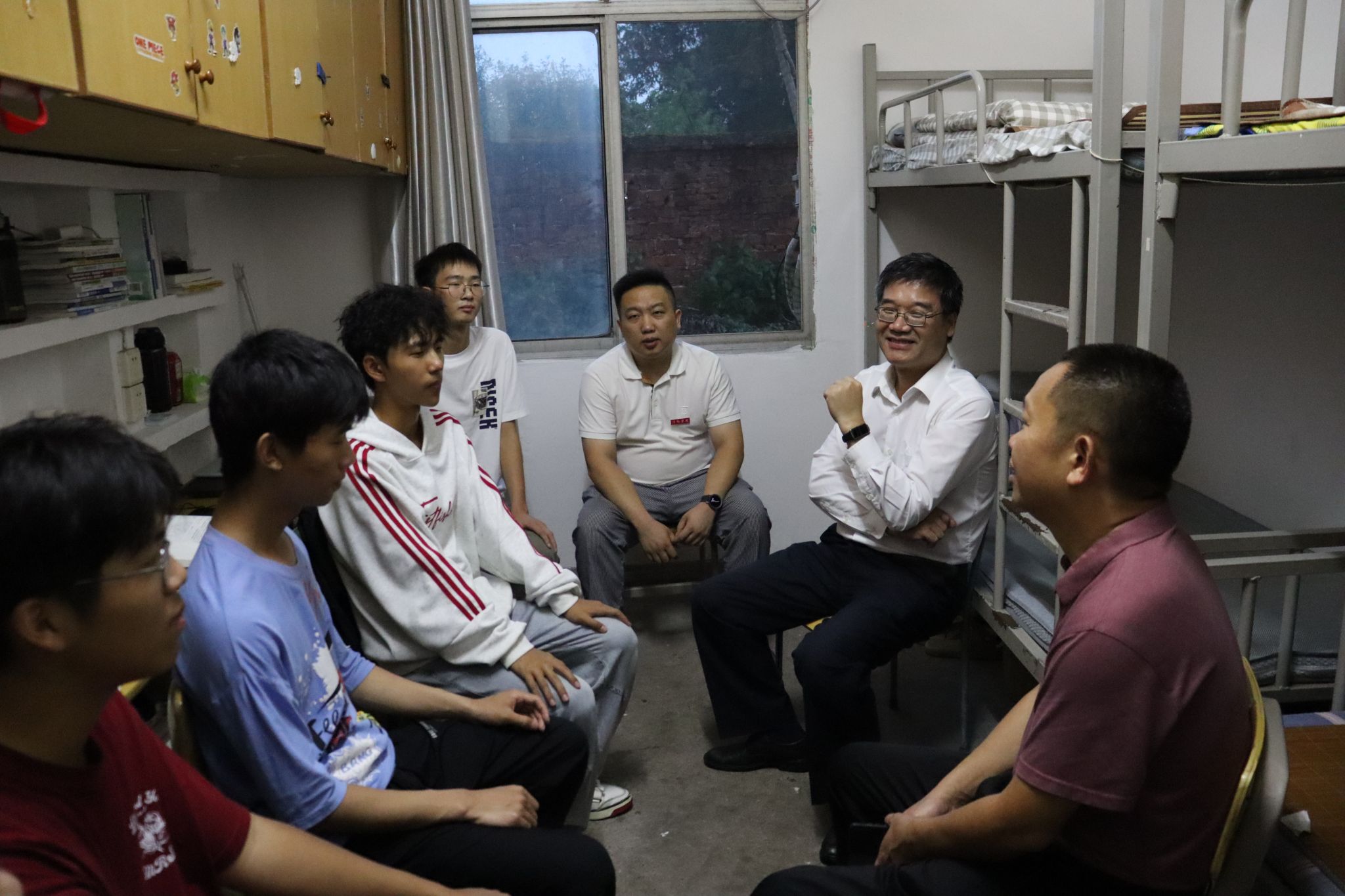 饭后,邱晓辉来到3栋学生宿舍,走访寝室,看望学生。他详细询问大家的学习和生活情况,并嘱咐同学们要注意安全,宿舍要保持卫生,共同营造干净整洁的宿舍环境。他希望,大家多参加运动,保持充沛的精力,做到快乐学习,健康生活,在学校要养成积极向上的生活习惯,保持阳光开朗、乐于表达的良好心态,给自己留下丰富、充实、美好的大学时光。