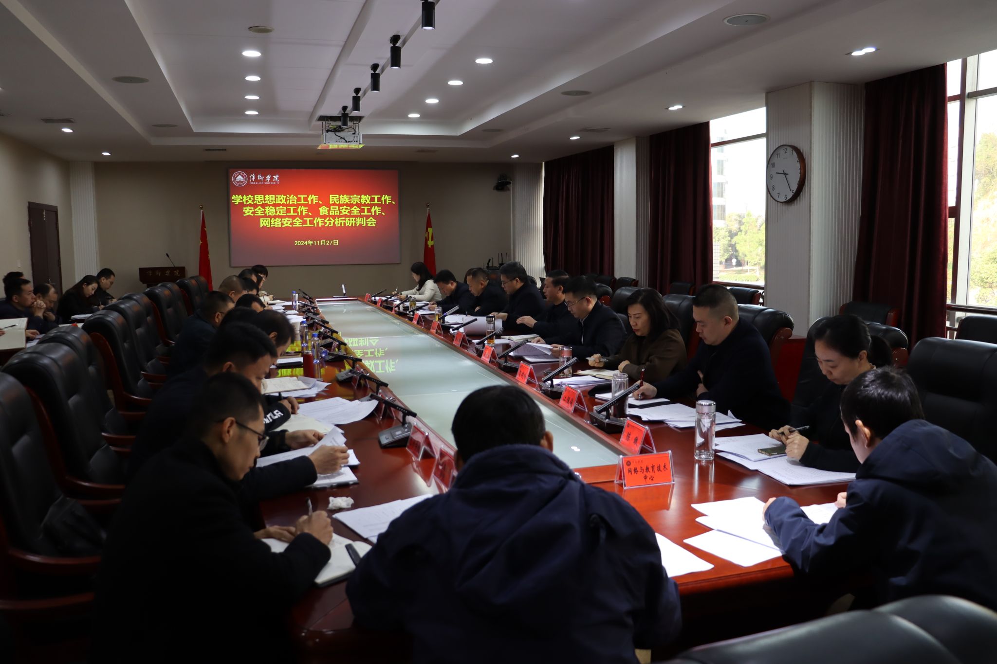 11月27日,我校在至善楼第一会议室召开思想政治、民族宗教、安全稳定、食品安全、网络安全等领域工作分析研判会。校领导邱晓辉、陈永国、刘培圣、王林清、曾敏、贺晓梅出席会议。相关部门负责人以及各二级学院党委书记参加会议。党委书记邱晓辉主持会议并讲话,他强调,全校上下要提高站位,加强教育。要深入排查,全面整改。要强化责任,全员共治。要以时时放心不下的责任感、积极担当作为的精气神,知责尽责、履责担责,切实为广大师生营造安全和谐的学习生活环境,为推进学校高质量发展作出新的贡献。