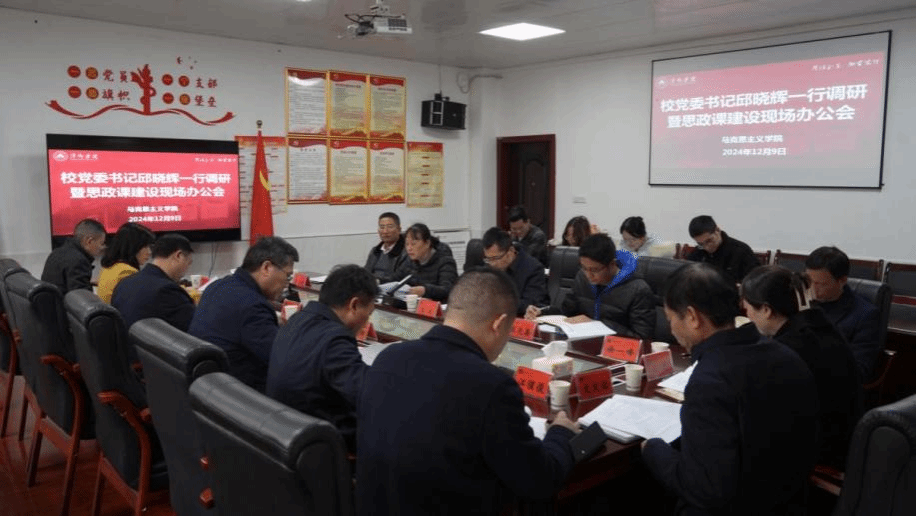 为深入贯彻落实习近平总书记关于思政课建设的重要指示精神,进一步推动我校思想政治教育工作高质量发展,12月9日,校党委书记邱晓辉一行深入马克思主义学院,实地调研教学设施、办公环境、文化氛围营造等情况,并主持召开思政课建设现场办公会。党委委员、副校长陈永国,党委委员、宣传部部长曾敏,党委委员、统战部部长、教务处处长贺晓梅出席会议,党政办公室、科研处、计财处、人事处、后勤处等部门负责人陪同调研,马克思主义学院领导班子及教师代表参加。