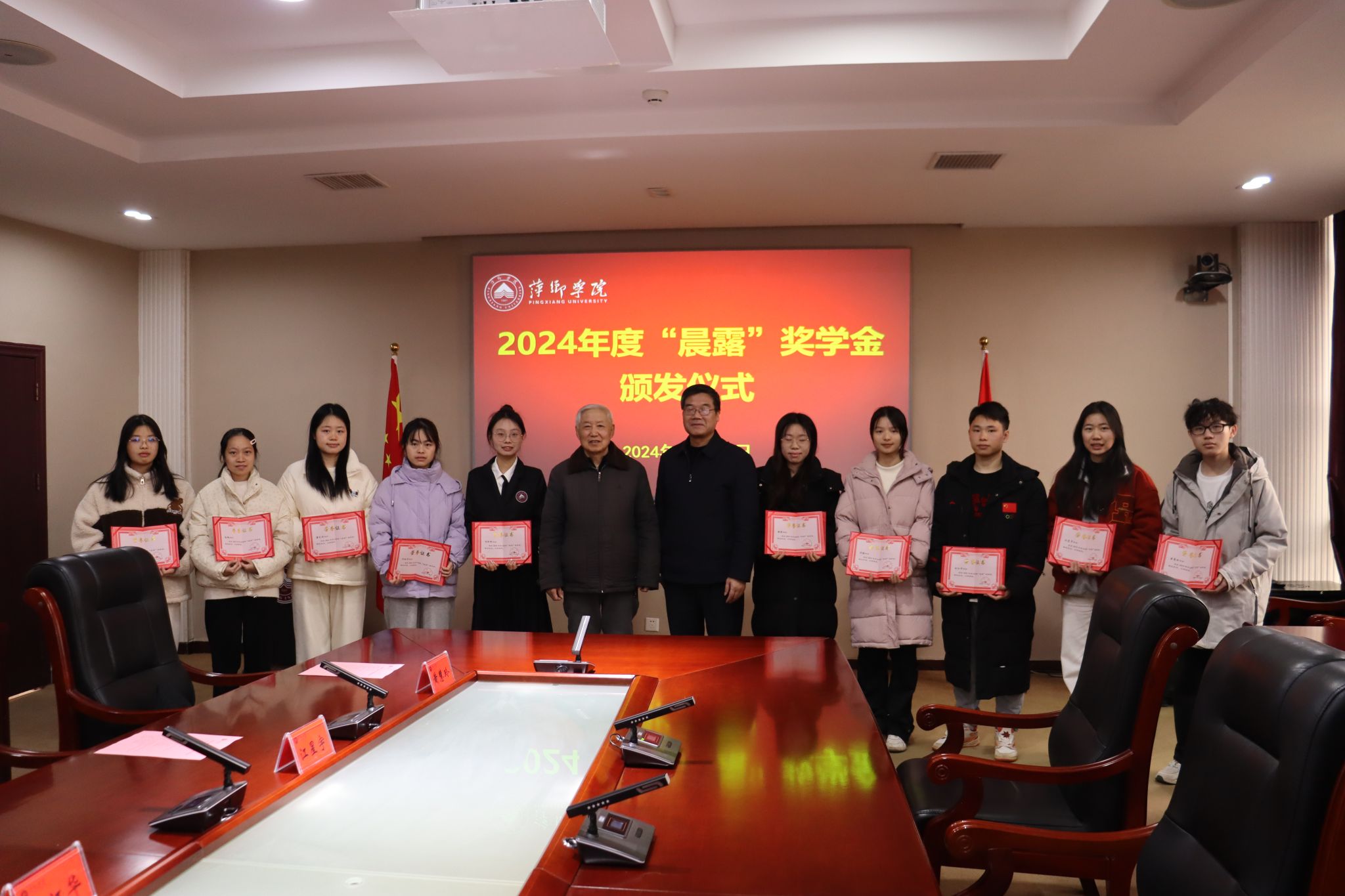 仪式上,学工处处长陈敢宣读了《关于授予徐斌慧等10名同学2024年萍乡学院“晨露”奖学金的决定》。尹兆书和邱晓辉为获奖学生颁发了荣誉证书。