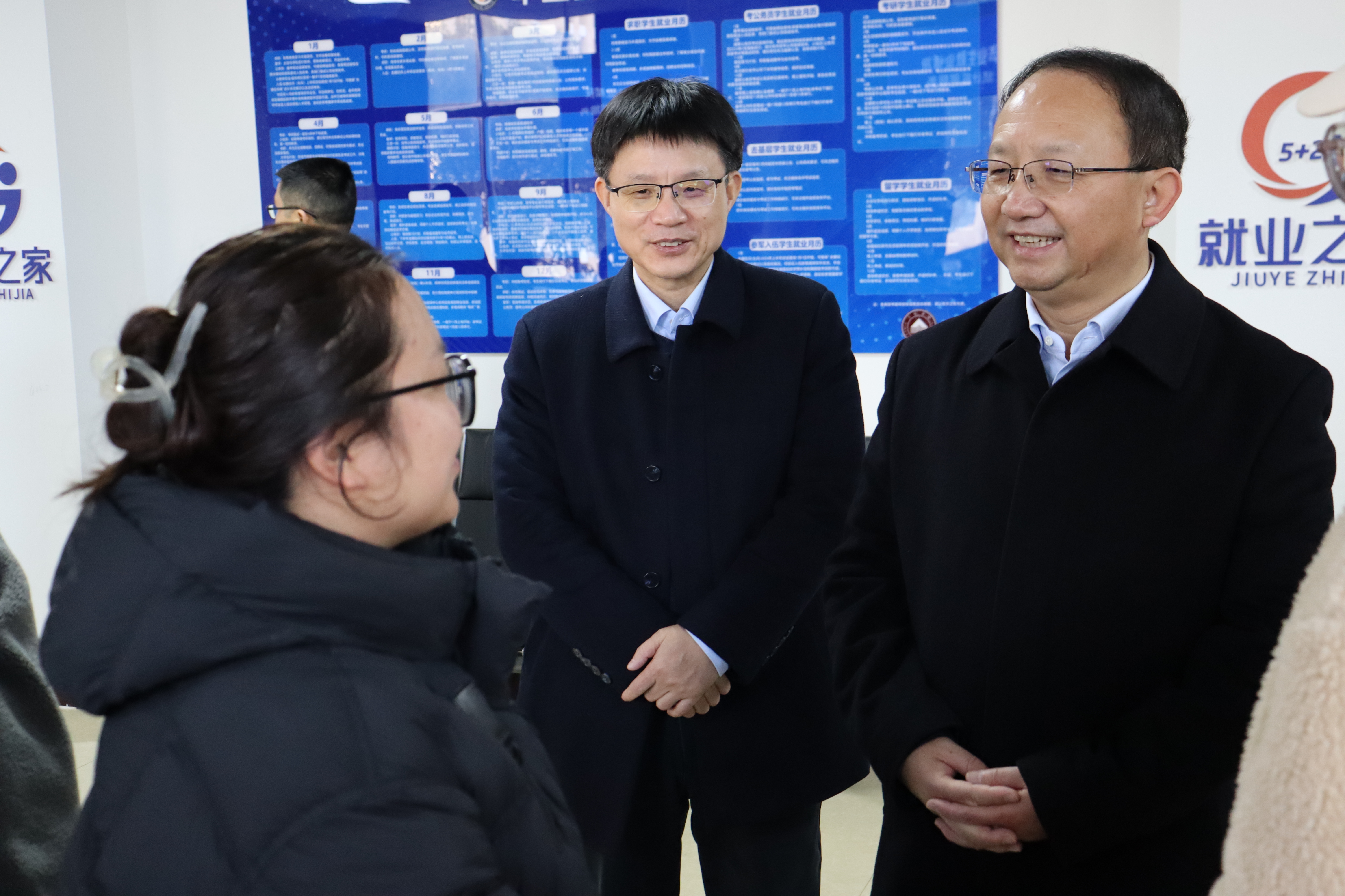 随后,王少玄一行来到至善楼一楼“5+2就业之家”,专题调研学校促进大学生就业创业工作。在就业之家服务大厅,王少玄亲切地与在现场咨询的毕业生交流,询问他们的就业意向、考研情况和存在的困难等。
