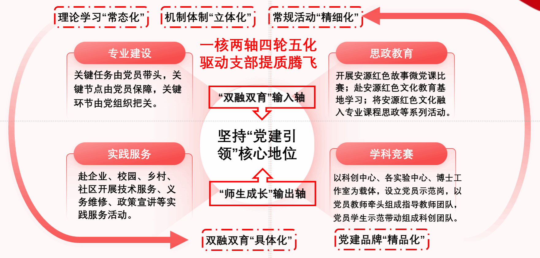 坚持党建引领核心地位下,“双融双育”输入轴和“师生成长”输出轴,两轴联动,传递党建工作与中心工作融合发展动力,推动学院学校各项事业高质量发展。党支部和党员充分发挥战斗堡垒作用以及先锋模范作用,在专业建设,教师成长,学生成长和社会服务等方面发挥党建引领作用。