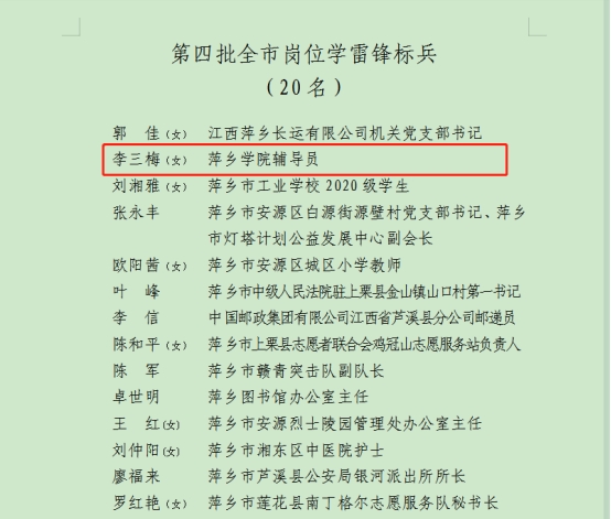 近日,萍乡市宣传部公布了第四批全市学雷锋活动示范点和岗位学雷锋标兵名单,我校初等教育学院教师李三梅荣获“全市岗位学雷锋标兵”称号。