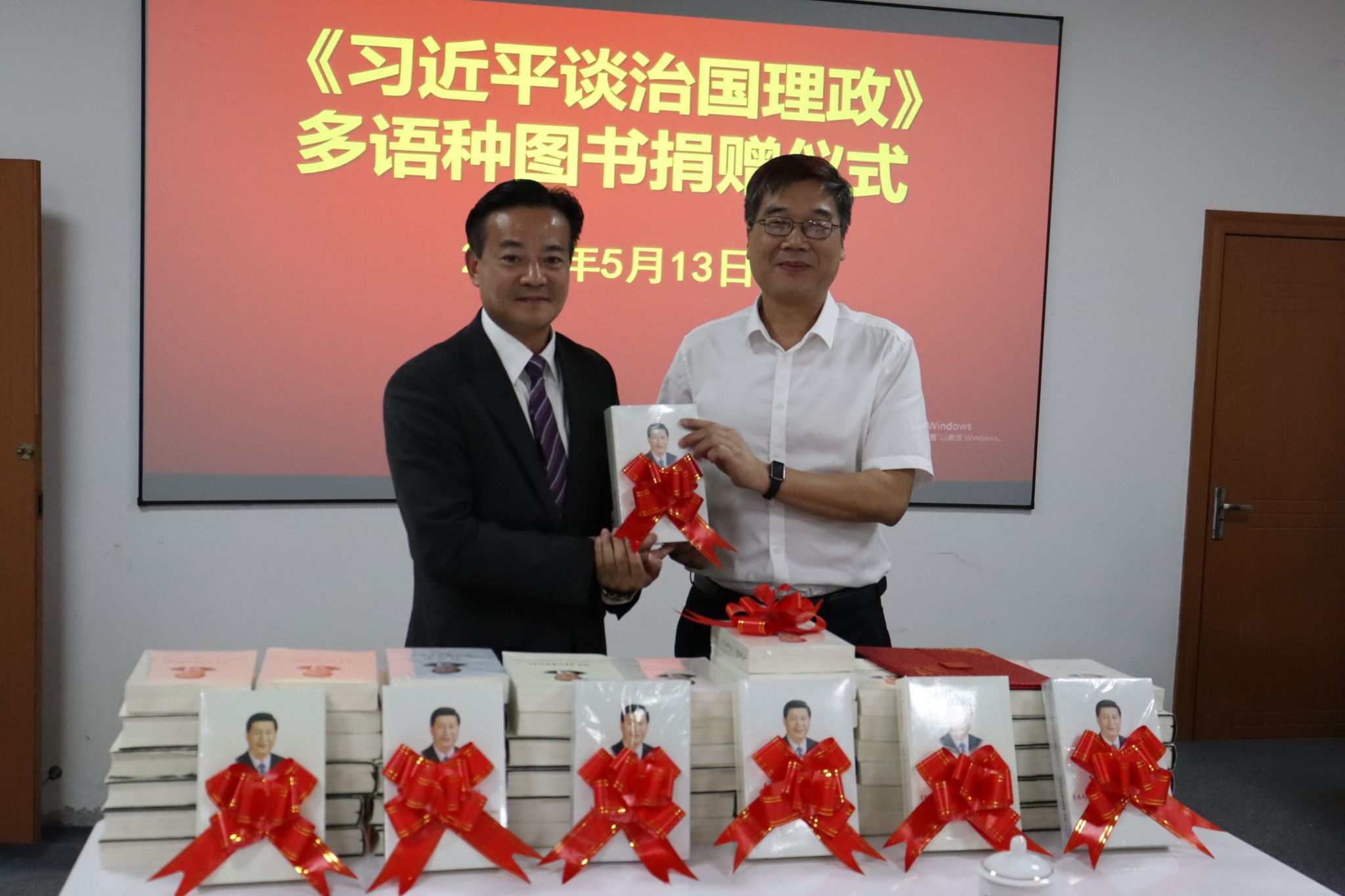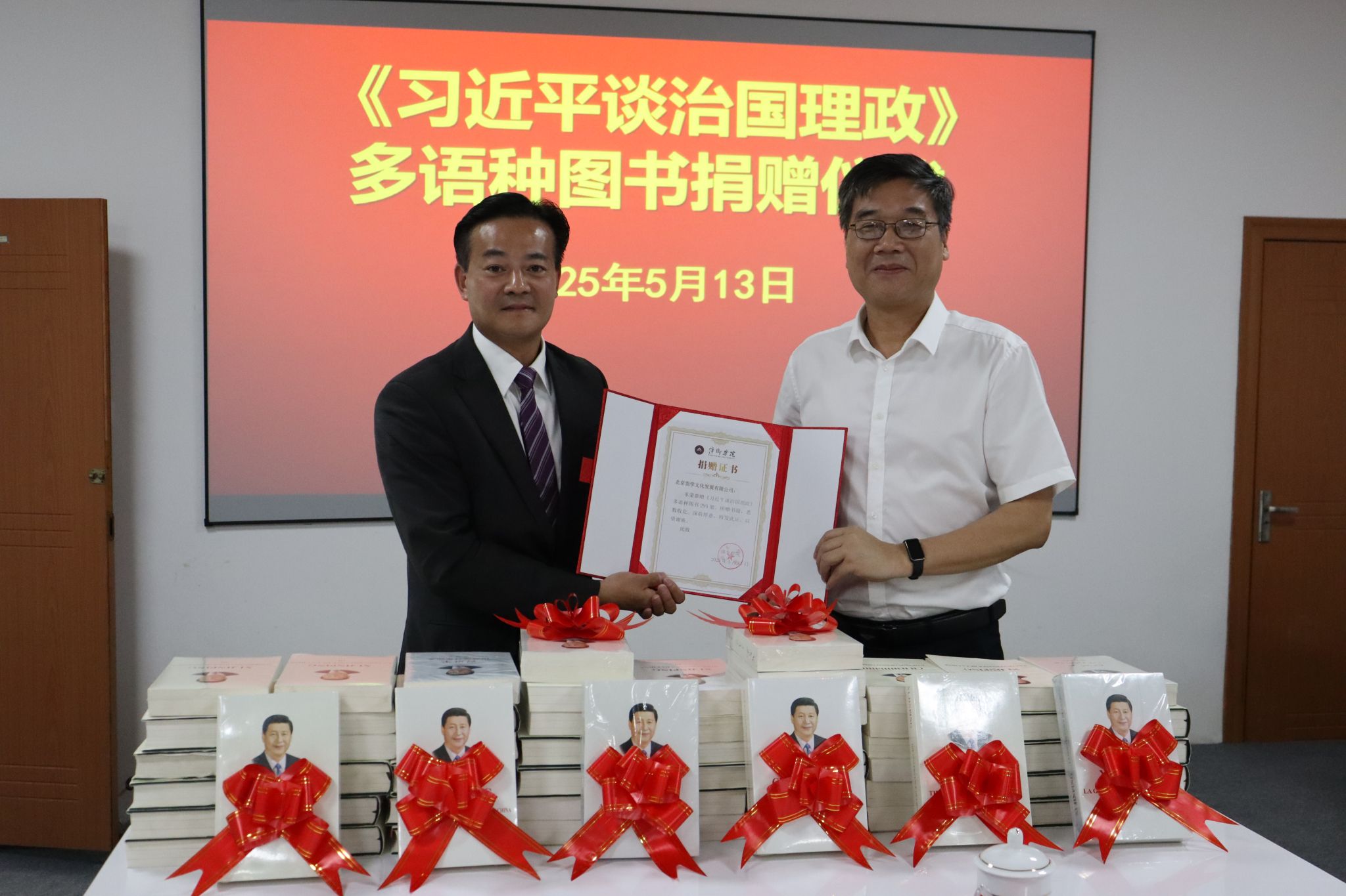 5月13日,《习近平谈治国理政》多语种图书捐赠仪式在我校图书馆二楼会议室举行。北京崇学文化发展有限公司总经理余富文,校党委书记邱晓辉等领导出席捐赠仪式。校党委委员、副校长陈永国主持捐赠仪式。邱晓辉代表学校向余富文先生颁发捐赠证书。学校党政办公室、党委宣传部、马克思主义学院、国际教育与交流中心、图书馆等部门负责人共同参加捐赠仪式。